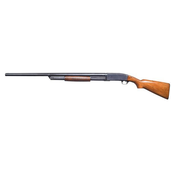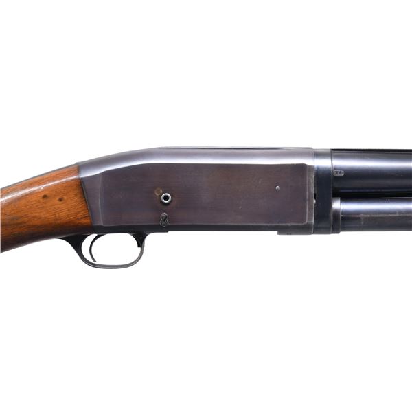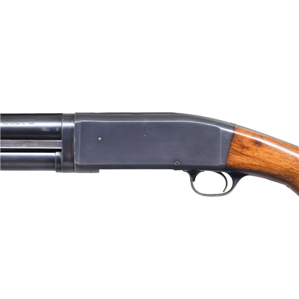 Cal. 12 ga. S# U183040. Bbl. 30" w/ solid rib. Original choke marking is full, actually measures slightly more open. Bottom ejection action. Grooved walnut forearm & pistol grip stock w/ original buttplate. CONDITION: over 80% lightly worn original blue showing slide & carry wear. Original wood finish shows light wear w/ scattered dents & marks. Sound action. Very good bright bore. (25-626/DS). CURIO. $300-450.