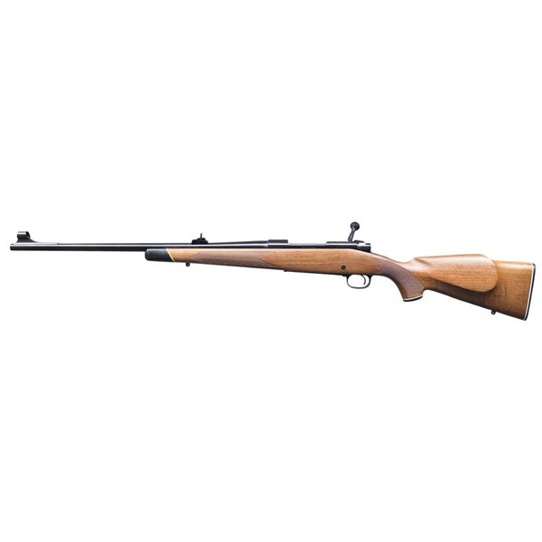 Cal. 308 Win. S#. G1209309. Bbl. 22" w/ hooded ramp bead front & sporting rear sight. Push feed action features jeweled bolt body, 3 position safety & hinged floorplate. Satin finished walnut stock has cut checkering & swivel bases. Black forend tip, grip cap & plastic buttplate have white line spacers. Mfg. 1975. UNATTACHED ACC; original box containing; hang tag, instructions, purchase card, service center list, Hunter's Pocket guide & sling swivels. CONDITION: as new, appears unfired. Near excellent bore. (25-793/DS). MODERN. $700-1100.