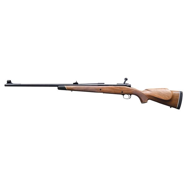 Cal. 7mm Rem Magnum. S#. G1282528. bbl: 24". Hooded ramp bead front sight w/ ramp mounted adj. rear sight. Push feed action has jeweled bolt body & hinged floorplate. Satin finished walnut stock has cut checkering black forend tip & grip cap w/ white line spacers. LOP: 13 1/4" over Winchester black pad. Mfg. 1976. UNATTACHED ACCESSORIES: original box containing: instructions, hang tag, purchase card, service centers list, Hunter's Pocket Guide & sling swivels. CONDITION: as new, appears unfired. (25-790/DS). MODERN. $700-1100.