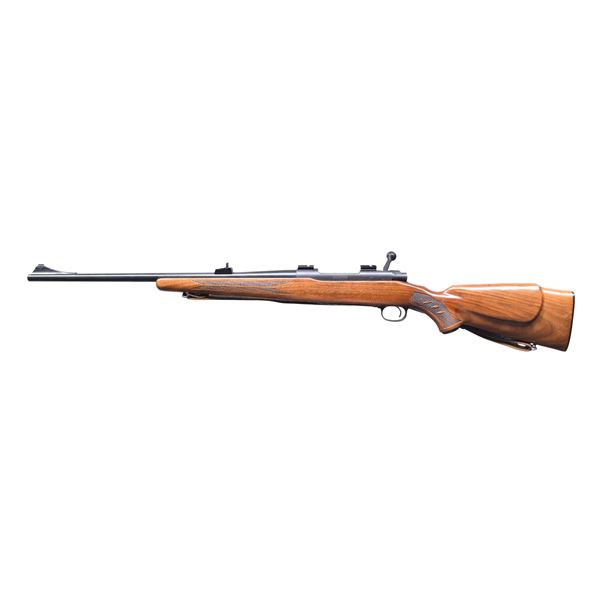 RIFLE. Cal. 30-06. S# 784389. Bbl. 21 7/8". Model 70 bolt-action rifle mfg. by Winchester in 1965. Left side of the bbl. is marked with the Winchester trademark logo, followed by the model and cal. designations. Left side of the receiver is marked with the Winchester trademark logo, with the S# marked on the right side of the chamber. Bbl. exhibits a blue finish, with the receiver, bolt handle, and bolt shroud exhibiting a dull blue finish. Bolt is jeweled in-the-white, with the trigger guard and floorplate exhibiting a black enamel type finish. One-piece checkered wood Monte Carlo pistol grip buttock. Stock is fitted with a brown leather sling. Ramped and aluminum beaded blade front sight with U-notch rear sight. Receiver is fitted with two black aluminum scope rails. CONDITION: Good, with metal components retaining the majority of their original factory finishes overall, exhibiting few spots of light wear, some scattered superficial handling marks, as well as some scattered spots of light surface oxidation. Mirror bore, exhibiting some spots of light pitting, while retaining well-defined rifling throughout. Stock shows scattered superficial marks and some minor impressions from handling and storage, but otherwise remains sturdy and serviceable. (24-7148/MLW). CURIO. $300-500.