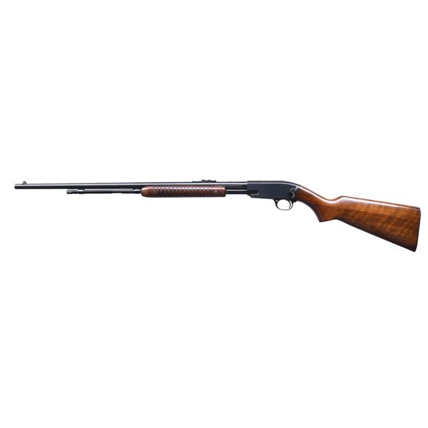 Cal. 22 S, L, LR. S# 253476. Bbl. 24" round w/ sporting sights. Receiver is grooved for tip-off scope mounts. Flat bottom grooved forearm & pistol grip walnut stock w/ checkered steel buttplate. Mfg. 1959. CONDITION: over 97% original blue showing slide wear w/ small scope mount marks on receiver grooves. Stocks have very good finish showing scattered light marks. Near excellent bore. (25-657/DS). CURIO. $800-1,200.