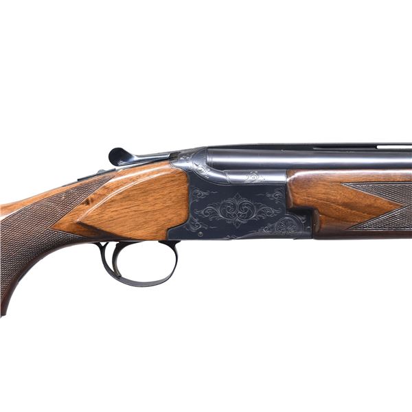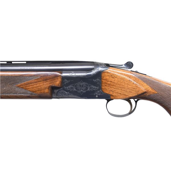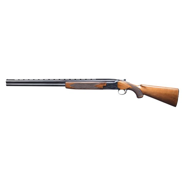 SHOTGUN. Cal. 12 Ga., 2 3/4". S# 89702 (Nov 1965). Mfg. in Japan by Olin Kodensha Co. The VR 28" barrels have brass front bead. Full over Mod chokes. Blued engraved boxlock action with SST & selective ejectors. Checkered Walnut stock set with Field style forearm, metal grip cap & Winchester buttplate. CONDITION: very good to near excellent blue with occasional pinprick patina & minor handling marks. Very good gloss finish with handling marks throughout. Shiny bores with light fouling. (25-533/MD). CURIO. $500-800.