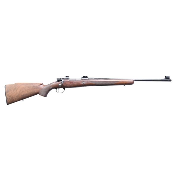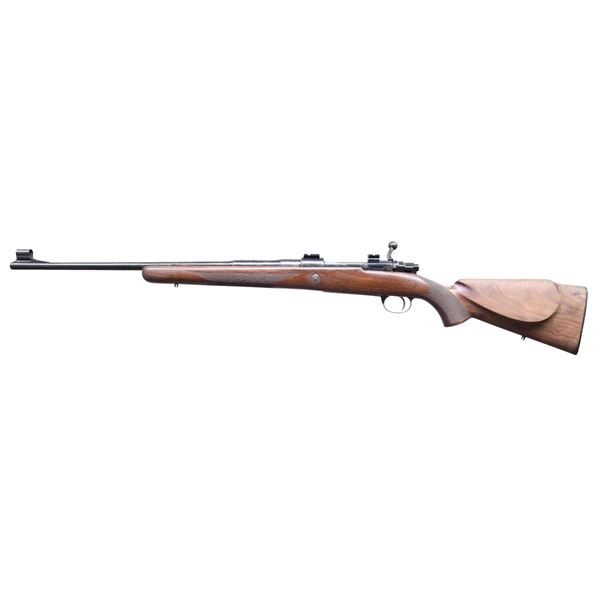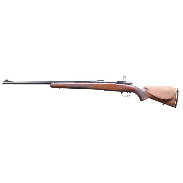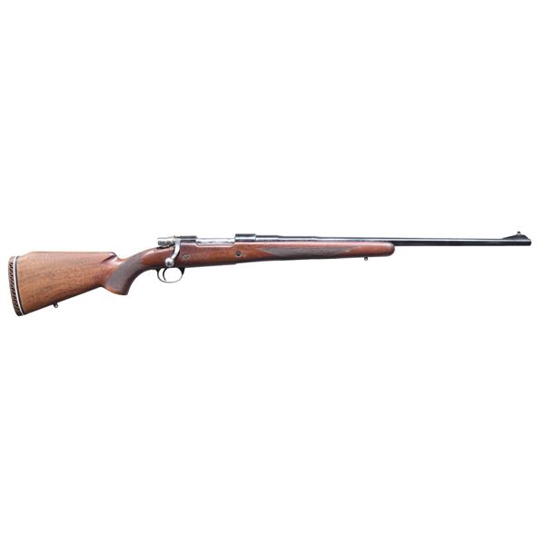 RIFLES. 1) Cal. 375 H&H. S# 58047 L70 (1970). Heavy 24" bbl. Bead front sight; open holes for rear sight & receiver bases. Short extractor push feed action. Engraving on floorplate. Replacement walnut checkered Monte Carlo pistol grip stock with 2 recoil lugs, sling eyes & Pachmayr pad. CONDITION: This rifle shows oxidation & pitting from salt wood damage. Barrel & receiver has very good blue in exposed areas with oxidation & marks. Stock has scattered marks & gouges with buttstock portion sanded. Ejector & bolt retainer missing. Shiny bore with strong rifling. (25-572/MD). 2) Cal. 30-06. S# 8L 45508 (1968). Barrel 22". Hooded bead front sight, filler screws in rear sight holes & Weaver bases on receiver. Control feed bolt with claw extractor. Walnut Monte Carlo checkered pistol grip stock with sling eyes & Browning buttplate. CONDITION: rifle metal & wood shows oxidation & pitting evident of salt wood damage. Barrel shows cold blue refinish in areas effected by salt wood; large deeply pitting area on barrel around forearm. Ejector is missing. Recoil lug on stock has oxidation. Buttstock area has been sanded; stock shows small chips & deep marks. Shiny bore shows strong rifling & spots of light pitting. (25-573/MD). ALL CURIO. $300-500.