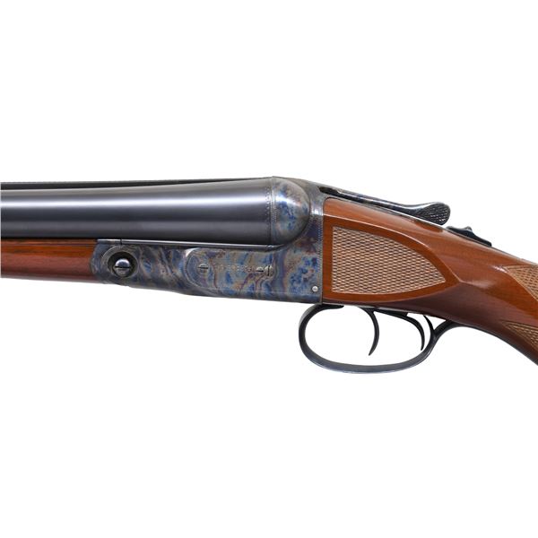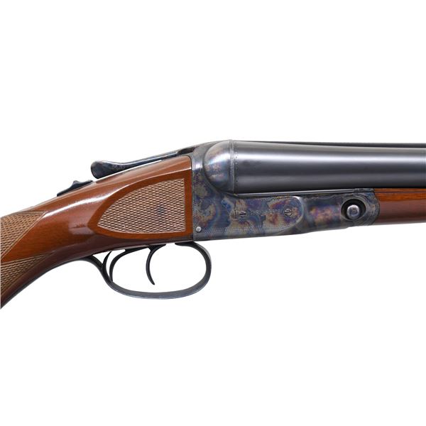 Cal. 12 gauge. S#. 100413. Bbl. 30" of Vulcan Steel. Fixed Full & Full chokes. Chambers are lengthened to 2 3/4" with long forcing cones. PC Sunspot front sight. No. 2 frame boxlock action has border line engraving. Double triggers & extractors. Splinter forend & capped pistol grip checkered walnut stock has added checkering on ears w/ name plate in toe line. LOP. 14 3/8" over an aftermarket Pachmayr pad. DAC. `1 7/8". DAH. 2 3/4". Weight 8 lbs. 1.2 ozs. Mfg. 1901. CONDITION: nicely restored shotgun. Bbls. have nearly all of their reblued finish. Action has restored colors. Refinished stock with recut checkering. Tight action. Very good bright bores. (25-764/DS). CURIO. $1000-1500.