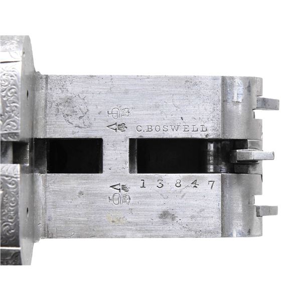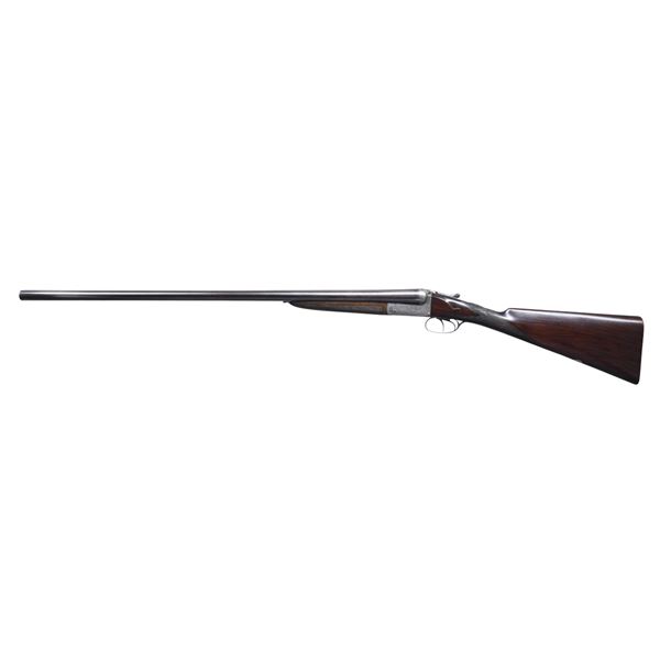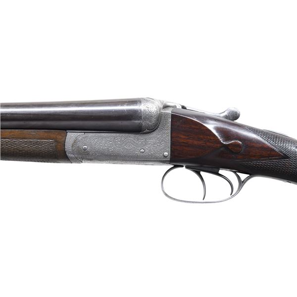 GAME GUN. Cal. 12 Ga., 2 1/2". S# 13847 (1900). The 30" barrels have swamped game rib & bright front bead. Fixed Full & IC chokes. Water table shows London proofs of 1904-1925 era & proofs of 1954-1989 era indicating refurbish work. Boxlock action with generous coverage of acanthus scroll and bouquets. Fences have sculpted ribbons. Action features double triggers, ejectors & top tang safety. Walnut forearm with push button release & straight grip stock having tear drops at ears, German silver name toeplate has engraved "CNF" name. LOP: 151/2" to grooved butt. UNATTACHED ACCESSORIES: luggage case in good condition showing wear. CONDITION: barrels has fading re-freshened blue of prior pitting along forearm channels & fading finish along carry areas. Action shows gray cleaned appearance with fading blue to trigger plate. Original forearm shows significant dents & wear. Re-freshened buttstock shows handling marks & wear. Shiny bores with fouling & areas of light pitting. Action appears tight on face & ejectors appear in time. (24-6940/MD). CURIO. $500-800.