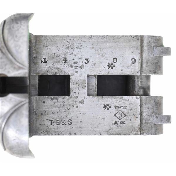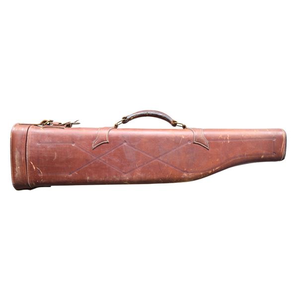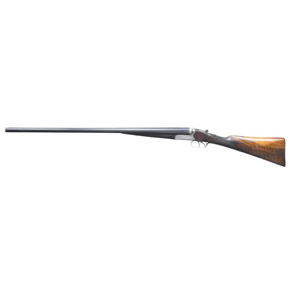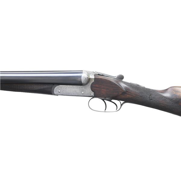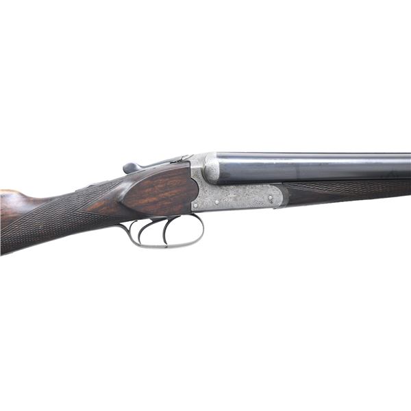 GUN. Cal. 12 Ga., 2 1/2". S# 14389. The 30" barrels have swamped game rib & flattened bright front bead. Full & IC chokes. Water tables have EPI import proofs & Birmingham proofs of original 1900's era along with 1966 proofs indicating refurbish work before reproofing. Boxlock receiver has generous coverage of acanthus scroll engraving on sides, blued floorplate, trigger plate, triggerguard bow, fences, top of receiver, top tang & top lever. Fences showcased sculpted relief & side clips. Action features double triggers, ejectors & top tang safety with gold inlaid "SAFE". Walnut splinter forearm with ebony tip, point pattern checking & Deeley release. Walnut straight grip stock with wrap around point pattern checkering & nameplate on toeline. LOP: 13 5/8" to hard rubber buttplate. UNATTACHED ACCESSORIES: Red Head Leg-o-mutton case showing heavy wear. . CONDITION: barrels have re-freshened finish showing prior pitting on sides of barrels extending from muzzle. Receiver has gray patina appearance with dull bluing on triggerguard & trigger plate. Forearms appears to have original worn finish with marks in checkering. Buttstock shows light sanding & refinished with recut checkering, large cracks & grain checks are through checkering. Fair buttplate. Shiny bores with light pitting. (24-6943/MD). CURIO. $400-600.