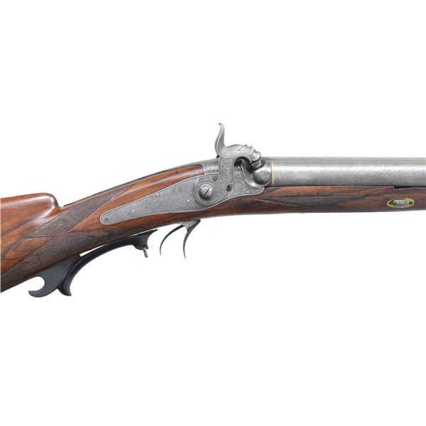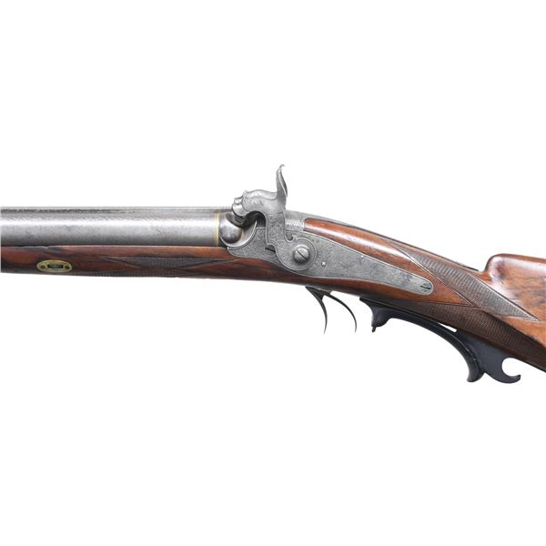 SHOTGUN. Cal. 16 Ga. NSN. Bbls. 28.5". Damascus bbls. with alloy bead on the flat rib. London Crown V proof on the rib in front of two gold bands. Lefaucheux-style back action locks, and the top tang plate has a scroll engraving, highlighting woodland hunting scenes on the locks with a resting hunter on top. Engraving on hammers. Wedge-fastened walnut stock with wraparound point pattern checkering on the forearm and wrist, spear-tipped finial thimble and trigger plate, and cheekpiece with relief floral carving. Horn buttplate. CONDITION: The bbls. have a very good Damascus pattern with spots of patina throughout; one ramrod pipe is missing. A portion of the horn triggerguard is missing. Wood has a good appearance with small, deep marks. Dark, pitted bores. (01-26209/MD). ANTIQUE. $300-1,000.