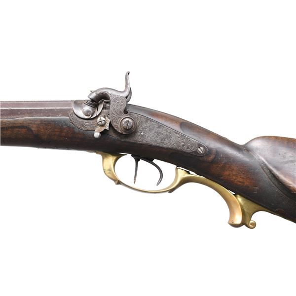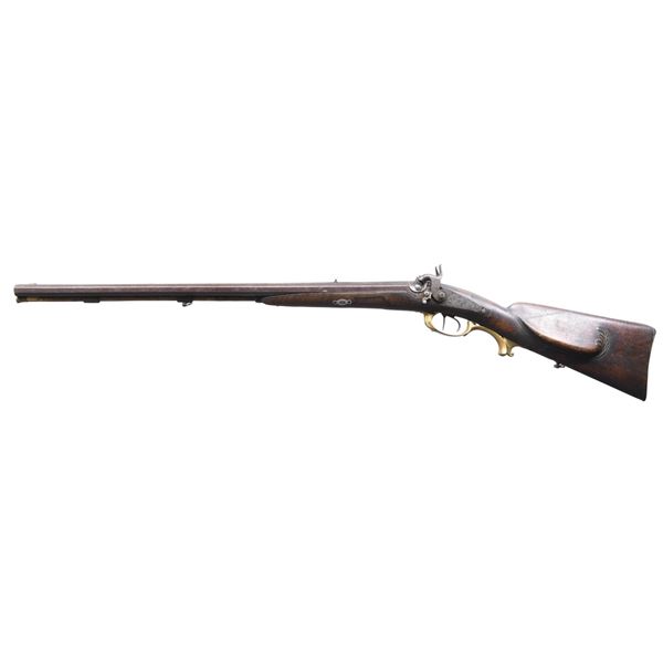 PERCUSSION PARADOX RIFLE. Cal. 60 / 20 Bore. NSN. Also known as a Ball & Shot gun, this rifle has 25 5/8" oct. barrels. Center rib has German silver blade front sight, notch rear sight & address "I. D. MORITZ & SOHN IN LEIPZIG". Ornate Lefaucheux style locks with scroll & floral engraving showing woodland scenes on locks along with dragon head ornamentation at head of locks & hammers. Lock has dog leg safeties. Wedge fastened walnut stock with metal buttplate & Jaeger style sliding wooden patchbox lid. Brass finger rest triggerguard. Ebony floral tip to guard. German silver wedge escutcheons. Hardwood ramrod held by 2 pipes & spear finial thimble. CONDITION: Barrels have brown patina appearance with wear & spots of oxidation. Locks and frame metal have gray patina appearance. Worn wood finish with worn to smooth checkering, areas of wood erosion, epoxy repairs & grain cracks. Dark pitted bores. (01-26191/MD). ANTIQUE. $400-600.
