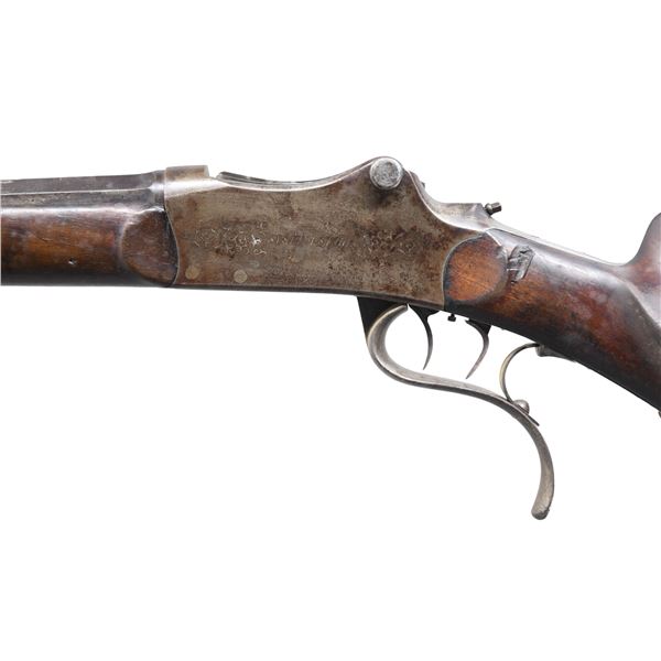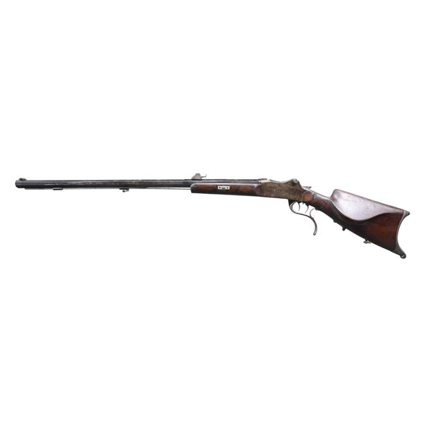 SYSTEM SINGLE SHOT SHUTZEN RIFLE. Cal. 8mm (possibly 8.15x52R). S# 2674. Oct. 30" barrel w/ relined bore. Matching numbered front sight base with modern dovetail filler, matching number tangent rear sight. Top of barrel has silver inlaid "I.D. MORITZ SOHN LEIPZIG." System Stahl single shot Martini style action with silver inlaid floral scroll. London "crown V" proof on barrel & action. Double set triggers within highly triggerguard opening lever. 2 Holes on top tang for aperture sight. Walnut wedge fastened forearm. Walnut cheekpiece buttstock with sling swivel & Schutzen buttplate. Modern steel rod held by 2 pipes under barrel. CONDITION: fair blue on barrel scratches, marks throughout. Action has gray/brown patina appearance. Wood has worn finish showing large gouges, mildew staining & small cracks. Shiny relined bore with strong rifling. (24-7006/MD). CURIO. $400-600.