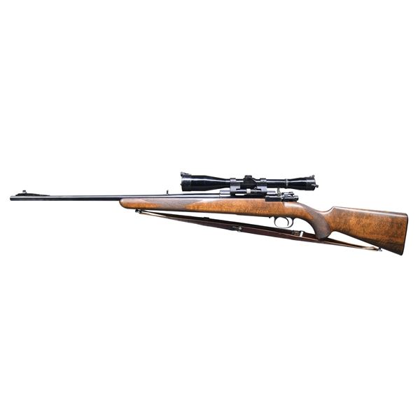 Cal. 30-06. S# 115586. Mfg. 1946-1951. Tapered 24" with Marbles bead front sight on ramp & folding rear sight. Receiver non-factory drilled & tapped for Pachmayr swivel base holding Lyman All-American 6x scope with crosshairs. Mauser 98 controlled feed style action w/ low swing flag safety. Receiver drilled for right side receiver base. Birch checkered sporter stock with hobbyist added compass & Husqvarna buttplate. Brauer Bros. brown leather sling on swivels. CONDITION: very good wood & metal finish showing light handling marks. Very good bore. Scope has good finish with deep marks; horizontal crosshair broken. (25-989/MD). CURIO. $300-500.