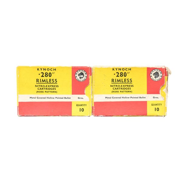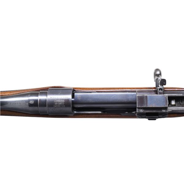 SPORTING RIFLE. Cal. 280 Ross. S# 9817. The tapered 26" barrel has band mounted blade front sight & 1 leaf express 500 yard island rear sight. Ross straight pull military action with 4 shot box magazine. Checkered walnut Sporter stock with schnable tip, replacement sling swivels, checkered hard rubber grip cap & checkered steel buttplate. UNATTACHED ACCESSORIES: 2 Boxes (15 rds.) of Kynoch 280 Rimless NE hollow point 160 gr. ammo. boxes in fair condition. CONDITION: good faded blue on most metal parts showing cycling wear, occasional spots of peppery oxidation & light handling marks. Lightly sanded & refinished stock has recut checkering, handling marks & sm. cracks. Shiny bore with strong rifling & light fouling. (24-6950/MD). CURIO.$800-1,200.
