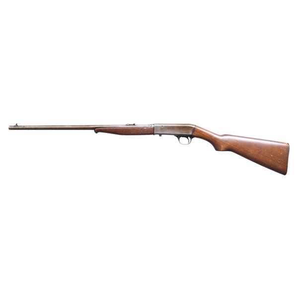 1) MODEL 24 AUTOLOADING. Cal. 22 LR. S# 44550. Mfg. 1922-1935. Barrel 19". Sporting sights. Takedown action. Walnut forearm & buttstock with tubular mag. CONDITION: barrel has a gray/brown cleaned appearance with spots of pitting. Sanded & refinished wood has large cracks & gouges. Good bore with pitting throughout. (25-683/MD). 2) MODEL 12A SLIDE ACTION. Cal. 22 S, L, LR. S# 789554. Barrel 21 3/4". Sporting sights. Tubular mag. Takedown action. Walnut stock set. CONDITION: fair fading blue with brown patina, marks & varnish overspray. Wood has added varnish showing marks, white paint & small cracks. Good bore. (25-710/MD). ALL CURIO. $400-600.
