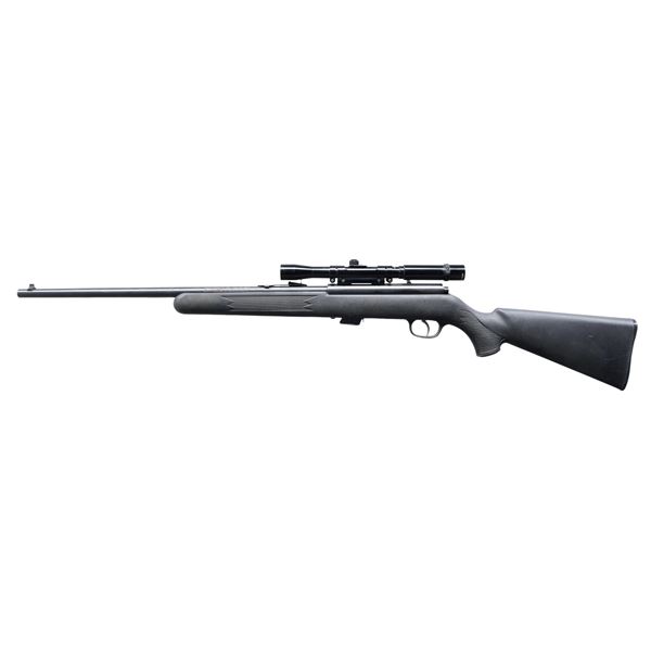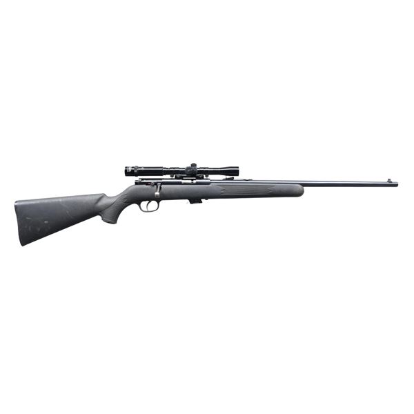 This lot consists of the following rifles: 1) SAVAGE MARK II BOLT ACTION RIFLE. Cal. 22 LR. S# 0089343. Bbl. 20 1/2". Bead front sight. Sporting style rear sight. Receiver mounted Universal Standard 3-7x20 scope. Scope has fine crosshair reticle & green tinted optics. Blued finish. Checkered black synthetic pistol grip stock. MAGS: 1-5 rd. CONDITION: stock shows scattered scuffing, scratches, handling marks & some dirt staining. Metal retains most of its original blue but shows scattered light oxidation along the edges & some scratches. Action functions properly when hand cycled. Very good + bright bore. (24-7132/MJC). 2) MOSSBERG MODEL 817 BOLT ACTION RIFLE. Cal. 17 HMR. S# HGL022501. Bbl. 21". Rifle is sighted with Centerpoint 3-9x32 scope only. Scope has mil-dot crosshair reticle with very good optics. Blued finish. Black synthetic pistol grip stock. MAGS: 1-5 rd. CONDITION: stock shows scattered handling marks. Metal retains 95% original blue with some scattered light oxidation specks. Action functions properly when hand cycled. Very good + bright bore. (24-7140/MJC). BOTH MODERN. $225-375 FOR BOTH.