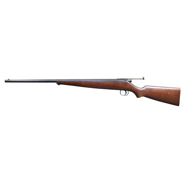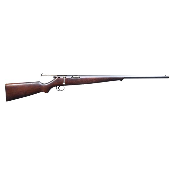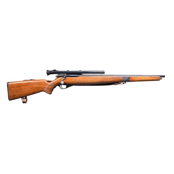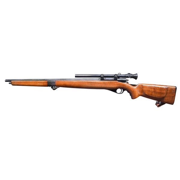 1) HARRINGTON & RICHARDSON MODEL 565 "PAL". Cal. 22 S, L, LR. S# 1707. Bbl. 22". Sporting sights. Hardwood stock. CONDITION: Near excellent blue. Very good wood finish with streaks of white paint & varnish. Shiny bore. (25-686/MD). 2) SAVAGE SPORTER. Cal. 22 LR. NSN. Barrel 23.25" integral with receiver. Bead front sight, open holes for rear sight & scope blocks; aperture peep sight extends past receiver on 6.25" base. Schnabel tip Walnut stock. MAGS: NONE. CONDITION: good blue mixed with pinprick patina & spots of peppery oxidation. Very good wood finish with light marks & mildew on right side. Bore shows strong rifling & scattered spots of pitting. (25-716/MD). 3) MOSBERG MODEL 46M(b). Cal. 22 S, L, LR. NSN. Bbl. 23". Front sight, rear sight & receiver sight are missing; Mossberg No. M4D 4 Power scope with crosshairs & side mount. Walnut stock with tubular magazine, loading port on bottom of forearm, Mossberg sling swivels holding brown leather sling. CONDITION: Fair fading blue showing wear, marks & varnish overspray. Sanded & refinished wood shows numerous handling marks. Shiny bore with strong rifling. (25-721/MD). ALL CURIO. $500-800.
