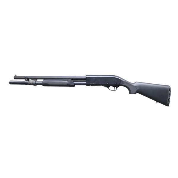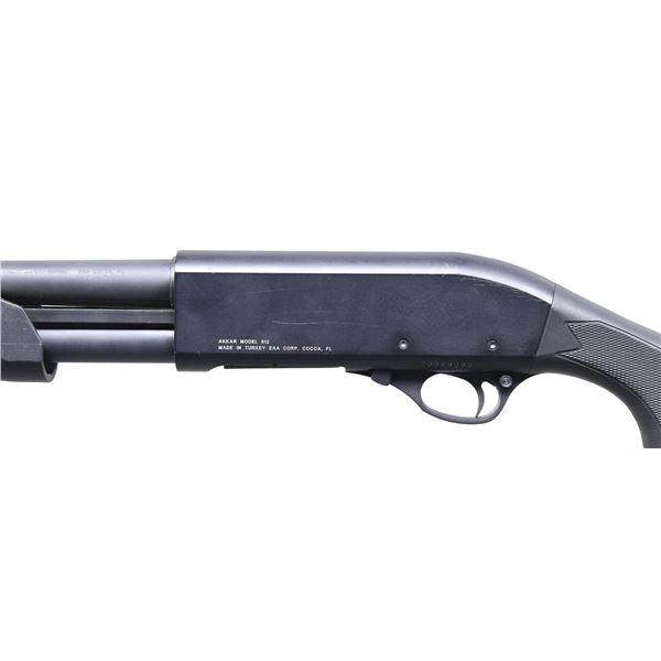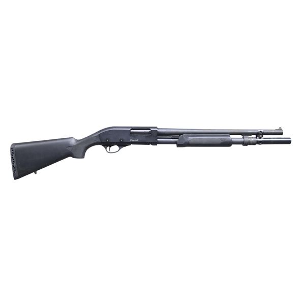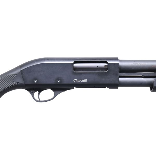 This lot consists of the following shotguns both in Cal. 12 Ga. 3": 1) CHURCHILL MODEL 612 PUMP ACTION SHOTGUN. S# 20049090. Bbl. 18 1/2". Ramped bead style front sight. Grooved rear sight. Turkish made shotgun imported by EAA. Choate mag extension. Matte gray finish. Black synthetic stock set with grooved recoil pad. LOP: 13 7/8". CONDITION: stock set shows scattered scuffs & handling marks. Metal retains 85% original matte gray finish with some light oxidation, scattered edge, operational & handling wear. Action functions properly when hand cycled. Very good bore. (25-599/MJC). 2) DICKINSON TR 14 AK SEMI AUTO SHOTGUN. S# TR14AK9666. Bbl. 28 with VR & modified choke. Fiber optic front sight. Dickinson imported semi auto shotgun. Matte black finish. Black synthetic pistol grip stock with black recoil pad & forend. LOP: 14 1/4". CONDITION: stock set shows some light handling marks. Metal retains 95% original matte black finish with a couple spots of light oxidation, some edge wear & handling marks. Action functions properly when hand cycled. Bright near excellent bore. (25-603/MJC). BOTH MODERN. $350-550 for pair.