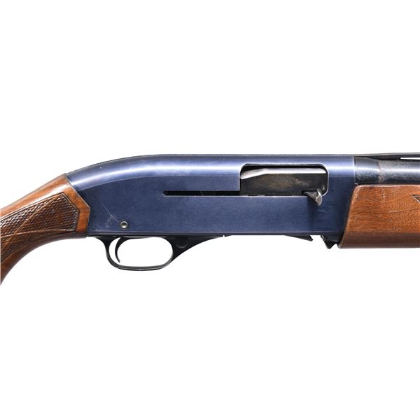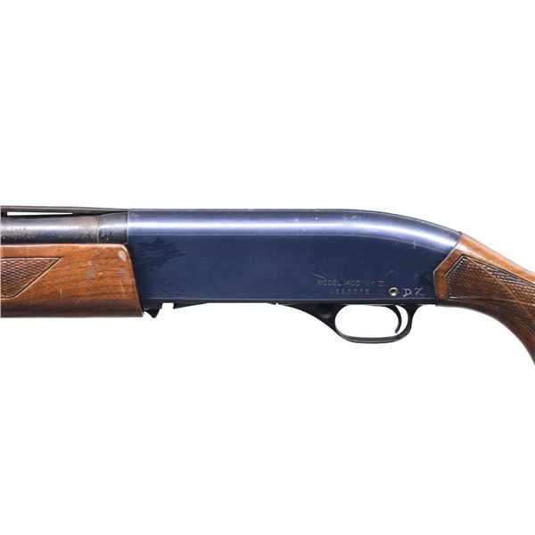 This lot consists of the following shotguns: 1) WINCHESTER 1400 MKII SEMI AUTO SHOTGUN. Cal. 12 Ga. 2 3/4". S# N526576. Bbl. 26" with VR & imp. cyl. choke. Fiber optic front sight. Blued finish. Right rear of receiver has etched letters "DZ". Checkered walnut pistol grip stock with factory recoil pad & forend. LOP: 13 7/8". CONDITION: stock set has added varnish with scattered dings, scratches & handling marks. Metal retains 60% original blue with scattered edge wear, & oxidation most heavily at rear of bbl. Action functions properly when hand cycled. Very good bore. (25-596/MJC). 2) MOSSBERG MODEL 600AT PUMP ACTION SHOTGUN PARTS GUN. Cal. 12 Ga. 3". S# H397175. Bbl. 24 1/2" smoothbore. Bead front sight. Flip up rear sight. Parts gun that is missing the bolt, safety, trigger, trigger guard assemblies & some receiver pins. Blued finish. Pistol grip hardwood stock & forend. Butt stock is loose & may be missing additional parts. CONDITION: stock set shows scattered handling marks, dirt staining & scratches. Metal shows overall oxidation with strong traces of bluing. Good bore. (25-601/MJC). BOTH MODERN. $200-325 for pair.