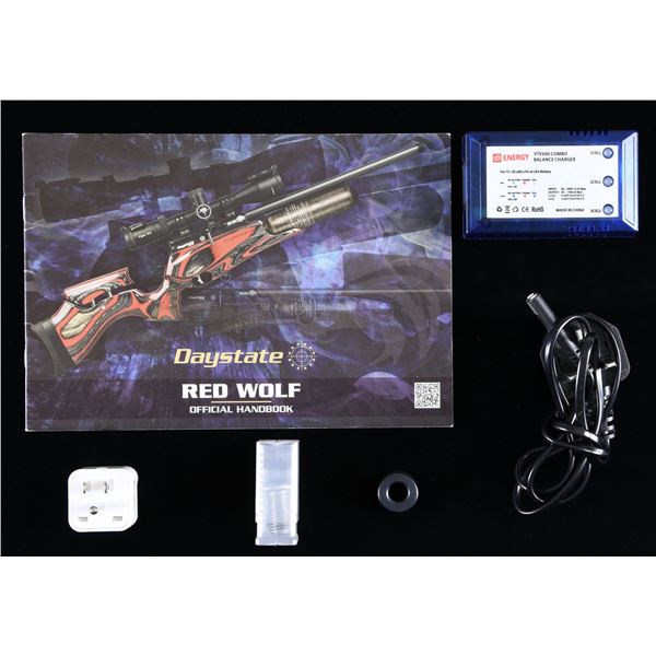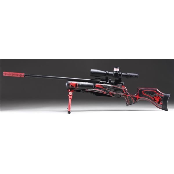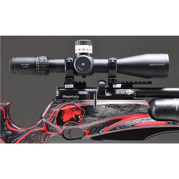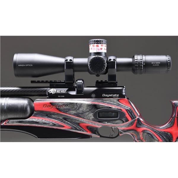 Cal. 30. S# RW5508. Bbl. 23" with 0DB air rifle suppressor. Air rifle is sighted with Arken SH-4 GENII 6-24x50 scope. Scope has crosshair reticle & very good optics. High end British made air rifle. Bbl. has carbon fiber finish. Red laminate stock with Red Wolf stickers, adjustable buttpad & cheekpiece. Folding red bipod present on front of stock. UNATTACHED ACCESSORIES: manual, paperwork , battery & battery charger. CONDITION: all aspects rate very good + or better with some light handling & usage wear. (02-23967/MJC). $1200-1800.