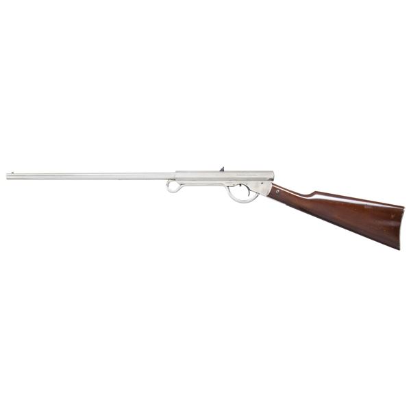 Cal. .21. S# 12042. Smoothbore 18" bbl. Nickel finish. Spring piston, push barrel cocking action. Walnut buttstock with nickel curved buttplate. CONDITION: very good nickel with light spots of patina & light handling marks. Good wood finish with handling marks. Shiny bore with spots of light pitting. (02-23811/MD). $200-400.