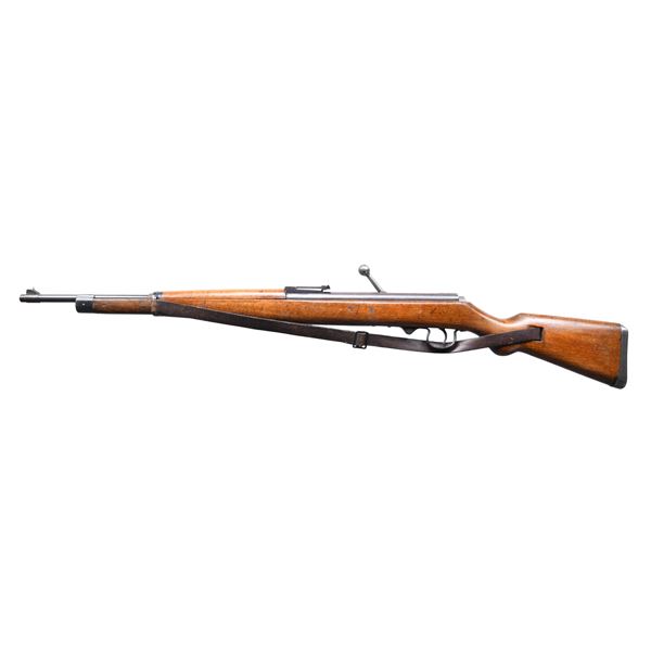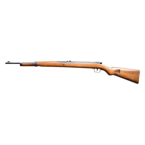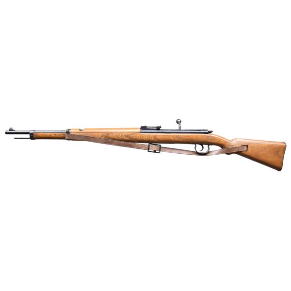 1) DIANA MODEL 30. Cal. .177. NSN. Barrel 19". Blade front sight & fixed rear sight. Loading lever hidden in forearm. Walnut stock set similar to K98 carbine. CONDITION: Barrel has good blue overall. Receiver has large streaks of brown cold blue finish mixed with original blue. Wood has Good finish with handling marks & chips around buttplate. Good shiny bore. 2) HAENEL SPORT MODELL 33. Cal. .174. S# 3448. Military style rifle with blade front sight & 40m tangent rear sight. Walnut stock set with cut style buttplate & brown leather sling. MAGS: 1 - 6 rd. CONDITION: barrel has good blue with numerous handling marks. Receiver exposed metal has gray patina appearance with numerous marks. Bore shows shine & rifling. 3) TELL / VENUSWAFFENWERK MARS 115 RIFLE. Cal. 4.5mm. NSN. German Youth training rifle based on Anschutz Model 275. Military style rifle with blade front sight & tangent rear sight. Walnut stock set with brown leather sling. CONDITION: good blue mixed with handling marks & peppery oxidation. Good wood finish with handling marks. Shiny bore w/ 5" counterbored section. (02-23919-2/MD). $500-750.