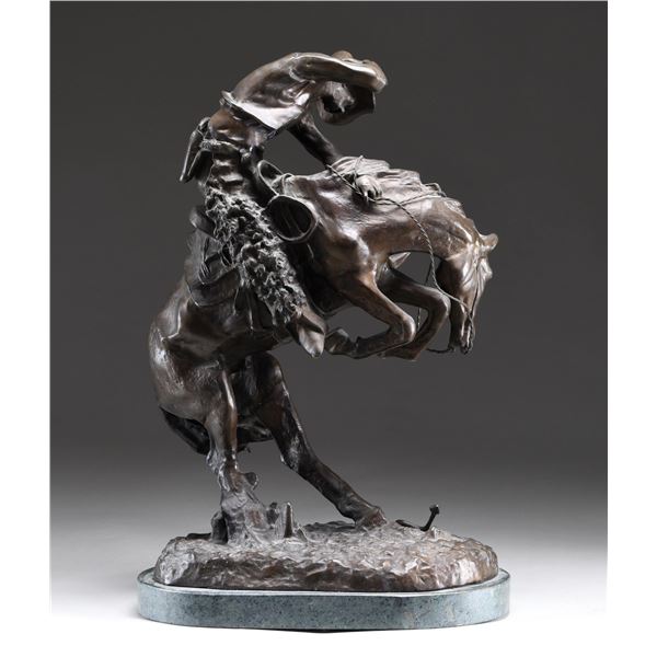 FREDERICK REMINGTON'S THE RATTLESNAKE FROM THE COLLECTION OF LT. COL. WILLIAM S. BROPHY. The bronze shows a cowboy clinging desperately to his horse, which is fearfully rearing away from a rattlesnake. The bronze is marked "Frederick Remington Copyright". The statue is mounted on a granite oval base, which measures approx. 8 1/2" by 14". The entire statue is approx. 22 1/2" tall & measures approx. 15" in width. CONDITION: statue appears in very good condition. Details including the rattlesnake are complete. PROVENANCE: letter dated February 17, 2025, "To whom it may concern, The lot consists of a reproduction of the notable Frederick Remington bronze entitled 'The Rattlesnake'. Once owned by the late Lt. Col. William S. Brophy (Ret). Thank you. Best regards, Gail Brophy Barry". (02-24006/RW). NON-GUN. $400-600.