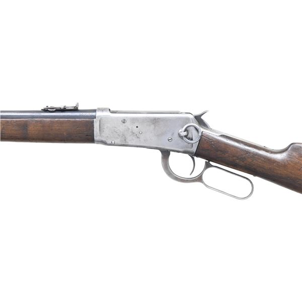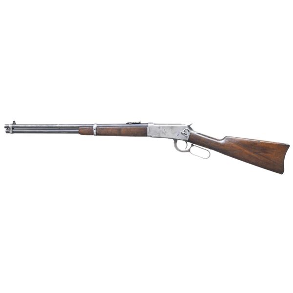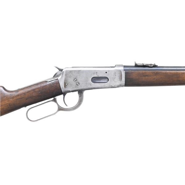Cal. 30 WCF. S# 803005. Bbl. 20". Replacement pinned blade front sight w/ carbine leaf rear sight. Full length mag. Action has saddle ring on right side. Gumwood forearm & stock w/ steel carbine buttplate. UNATTACHED ACCESSORIES: included is a Cody Firearms Museum Records Office check detailing the following information, "S# Applied: Oct 22, 1915 / No configuration information available". CONDITION: bbl. & mag. tube retain 60% worn blue. Action has faded to gray Stocks show heavy handling marks & wear w/ a small crack on left side of action. Good mechanics. Bore has a lightly frosted appearance retaining strong rifling. (25-625/DS). CURIO. $800-1,200.