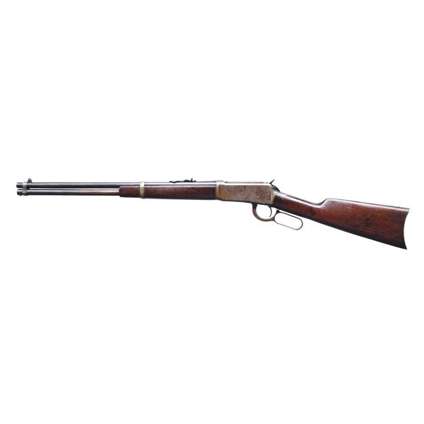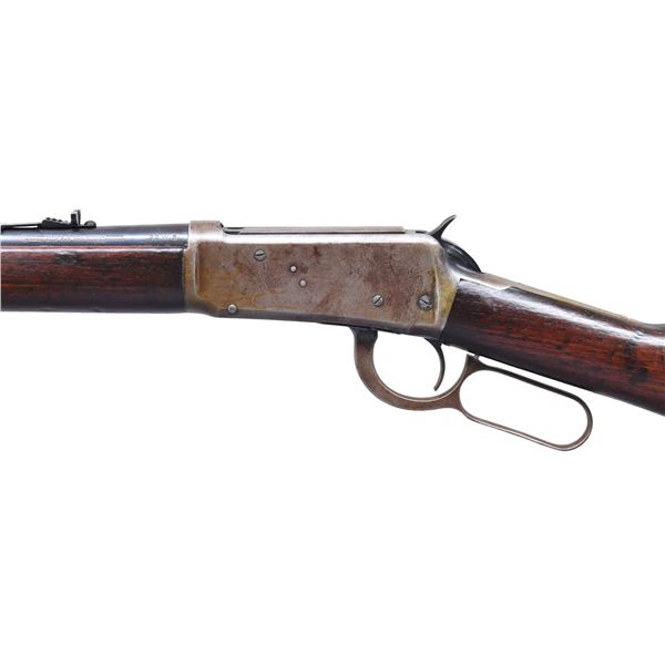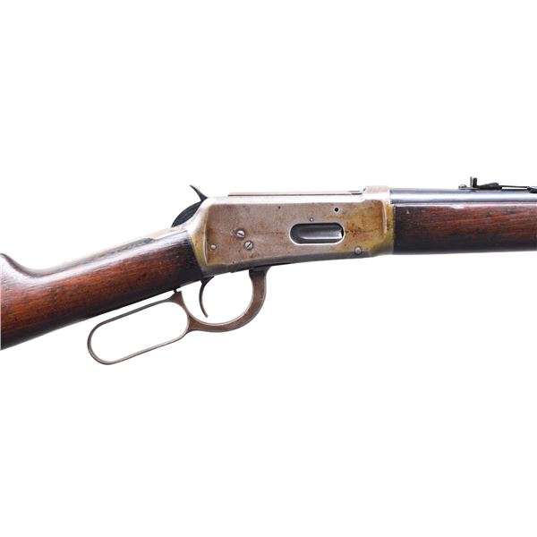 CARBINE. Cal. 32 W.S. S# 853111. Bbl. 20". Model 1894 lever action carbine mfg. by Winchester in 1919. Left side of the bbl. is marked with Winchester's mfg. and patent information, with "-NICKEL STEEL BARREL-/ ESPECIALLY FOR SMOKELESS POWDER", followed by ".32 W.S." marked towards the breech. Bbl. and mag. tube exhibit a blue finish. Plain wood straight grip buttstock and forend appear to have been lightly sanded and revarnished at one time. Buttstock is shy to the buttplate at the toe. Aftermarket brass beaded blade front sight, with Marbles U-notch rear sight. CONDITION: metal components exhibit scattered areas of lacquer, with the receiver, lever, and bbl. bands exhibiting wear through to a mottled gray patina, with areas of light to mild surface oxidation present overall. Bbl. and mag. tube retain fair amounts of their blue finish, exhibiting areas of wear and thinning that show through to gray and brown patinas. Bright bore, exhibiting a few small areas of mild pitting, while retaining strong rifling throughout. Wood furniture shows scattered marks and impressions from handling and storage, but otherwise remains sturdy and serviceable. PROVENANCE: From the Lifelong Collection of George Staden S&W Member #3451. (25-198/MLW). CURIO. $400-600.