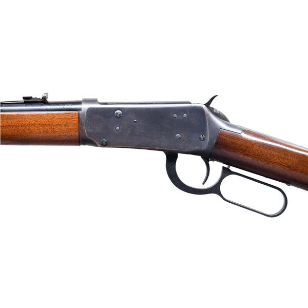 CARBINE. Cal. 30-30. S# 2728908. Bbl. 20" w/ ramp mounted bead front sight & sporting rear sight. Walnut forearm & straight grip stock w/ impressed checkered steel buttplate. Mfg. 1964. CONDITION: 90% blue w/ spots of flaking on action. Original wood finish shows a few scratches & marks. Near excellent bore. (25-699/DS). CURIO. $350-550.