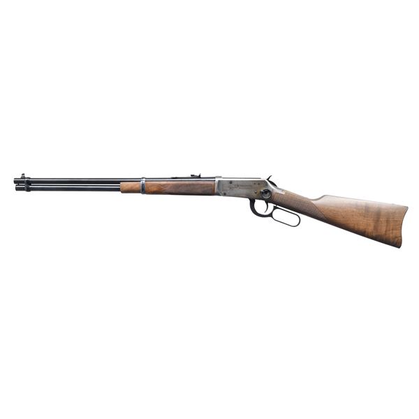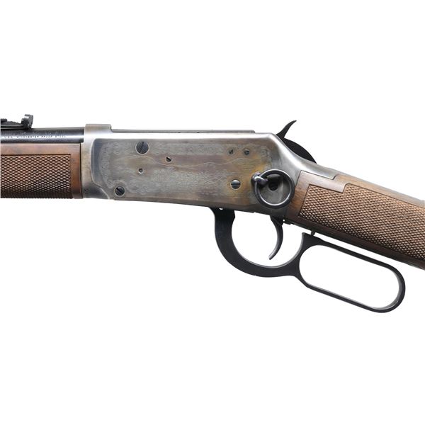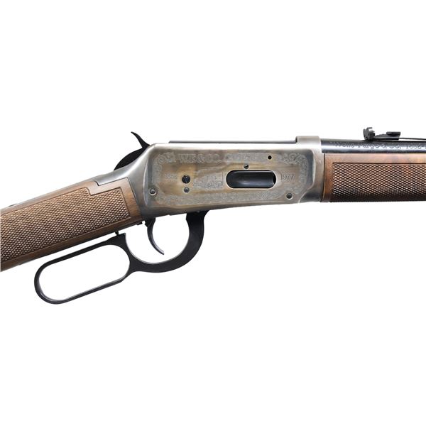 ACTION CARBINE. Cal. 30-30. S# WFC10445. Bbl. 20". Blade front sight with sporting rear sight. Full-length tubular mag. Antique-finished action has special Wells Fargo ornamentation. Band-fastened, long-wood forearm and straight-grip stock of fancy walnut with cut checkering and steel carbine buttplate. Right side of the stock has a Wells Fargo medallion. 1,999 mfg. in 1977. UNATTACHED ACCESSORIES: foam box with a decorative cover. CONDITION: 98% blue. Action has acquired a dark tarnish with age. Stocks have a very good finish. Bright, near-excellent bore. (24-2876/DS). CURIO. $600-900.