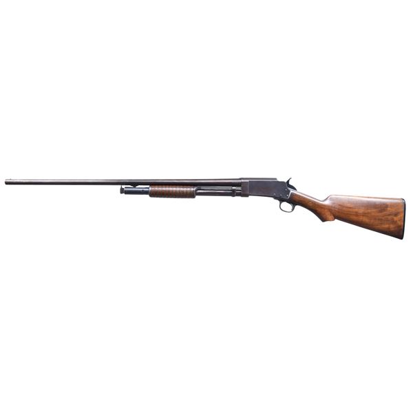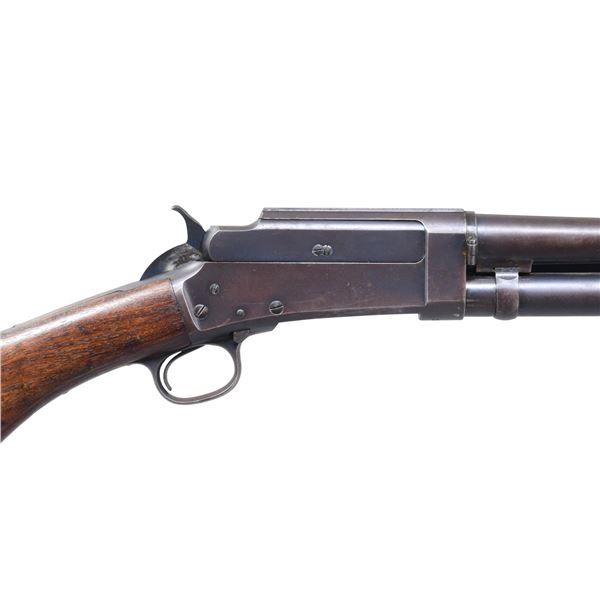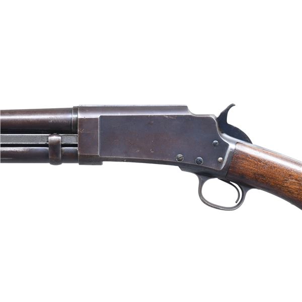 Cal. 20 Ga. S# 3528. Also known as the Model 30-20, mfg. 1915-1917; S# range 3243-35173. Barrel 28" with matting on top & bright bead. Full choke. Walnut grooved forearm & "S" curved pistol grip buttstock & Marlin hard rubber buttplate. CONDITION: barrel & receiver have a brown patina appearance with mag. tube retaining good dull blue finish showing scattered light marks, spots of light pitting & pinprick patina. Fair worn finish on forearm. Buttstock shows sanding & light refinish around buttplate with repaired toe. Shiny bore with light pitting near bore. (25-489/MD). CURIO. $300-500.