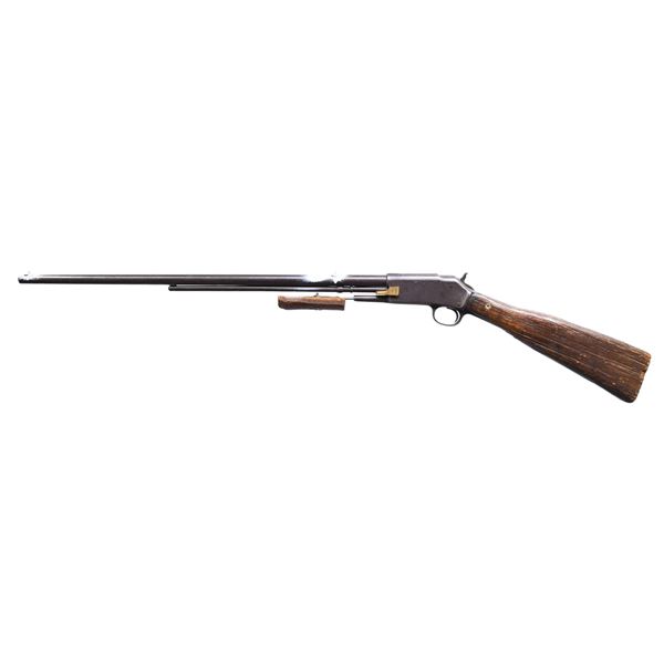 RIFLE. Cal. 22 S or L. S# 81571 (1903). Bbl. 24". Sporting sights. Replacement hobbyist-made pine forearm and buttstock. CONDITION: The balance of metal has a brown patina that shows pitting, with white and red paint over the sights. Poor wood finish. Two top tang screws and one action screw are missing. Bore shows pitting and rifling. The brass mag. tube retainer is loose and held in place by string. (24-7151/MD). CURIO. $200-300.