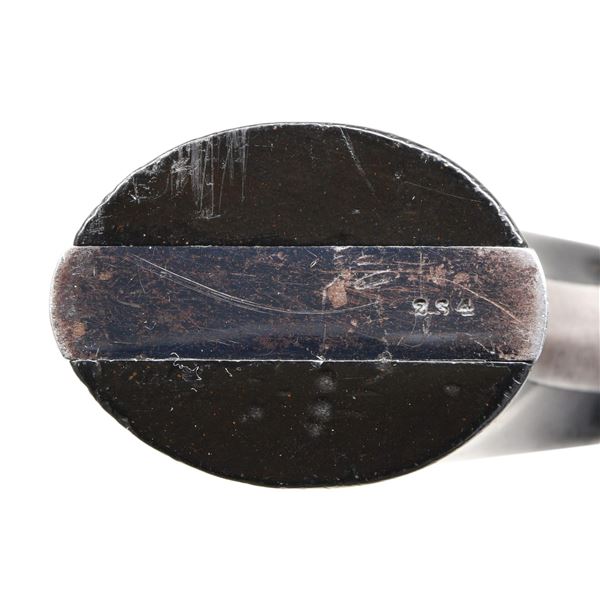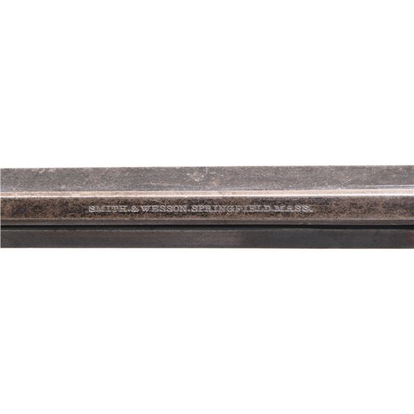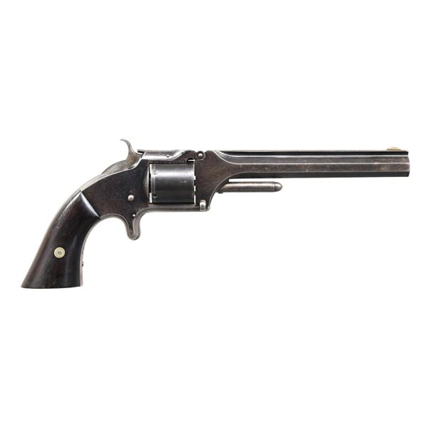 REVOLVER. Cal. 32, S# 234. This revolver is featured in June 1996 Gun Report article by Mike Bricker, in standard configuration, 6" blue finish, one line address, patent marked cylinder. Right side of frame below cylinder has had "KITTREDGE & CO" markings filed off. This revolver was made in summer of 1861. Mounted with varnished rosewood grips. Revolver is housed in a compartmented mahogany case with brown baize lining, with green label Winchester illustrated cartridge pack. UNATTACHED ACCESSORIES: copy of June 1996 Gun Report article "Smith & Wesson and Kittredge" which shows this revolver, but was in different casing. CONDITION: fine overall, complete & matching serial numbers and assembly markings, retaining 60% original blue with losses mostly on grip frame. Grips retain most of their factory varnish. Casing is sound and solid, 2 long aged hairline cracks in lid, lining soiled, stained, rubbed through where muzzle & hammer spur fit in case, cartridge pack is good and retains 5 cartridges. Functional key. The revolver when pictured in Gun Report article was in different casing. PROVENANCE: Lifelong Collection of Robert "Mike" Bricker. (01-26447/JS). ANTIQUE. $800-1,200.
