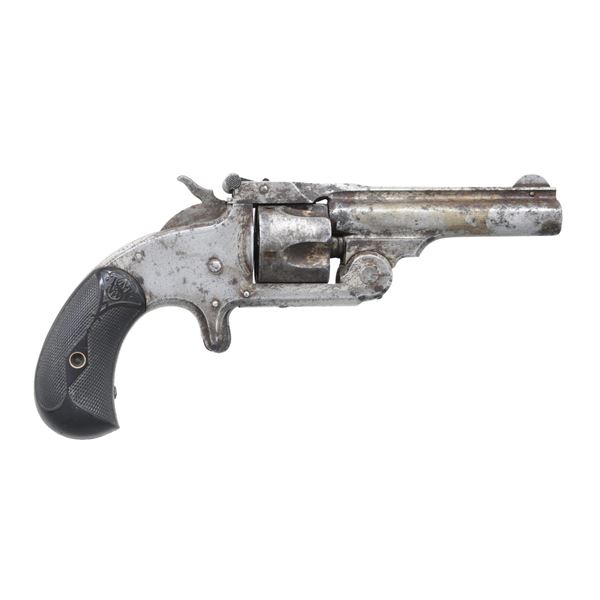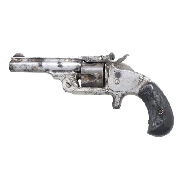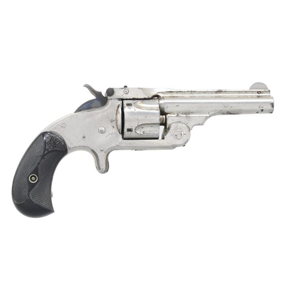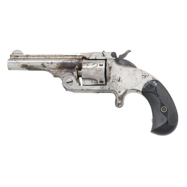 This lot consists of the following S&W Model 1 1/2 revolvers both in Cal. 32 S&W: 1) S# 48269. Bbl. 3". Round blade front sight. U-notch rear sight. Matching numbers on cyl., bbl. latch & frame. Nickel finish with case colored hammer. Checkered black grips with S&W logo. CONDITION: grips show scattered handling marks & checkering wear. Metal shows scattered light flaking & oxidation. Cyl. spins freely when hammer is cocked & will require attention to fix. Poor oxidized bore. (01-26242/MJC). 2) S# 88970. Bbl. 3". Round blade front sight. U-notch rear sight. Matching numbers on cyl. frame & bbl. latch. Nickel finish with case colored trigger & hammer. Checkered black grips with S&W logo. CONDITION: grips show scratches, dings & handling marks. Metal shows overall oxidation, scattered pitting, dings & flaking. Hammer does not cock cyl. & bbl. latch is loose. Poor oxidized bore. (01-26243/MJC). BOTH ANTIQUE. $300-500 for pair.