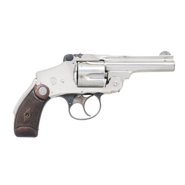 Cal. 38 S&W. S# 117369. Bbl. 3 1/4" with pinned 1/2 moon front sight blade; U notch incorporated into blued T shaped barrel latch. Mfg. 1898-1907 (approx. 104,000 units) having matching numbered cylinder and barrel latch on round butt nickel plated frame (blued trigger guard) with checkered grip safety; 2 screw side plate. Made with checkered hard rubber grips but fitted with J frame checkered walnut grips numbered 574026 having diamond centers and small silver medallions. CONDITION: very good overall appearance with some spots of oxidation pitting on top strap of barrel and T latch. Thinning of finish on trigger guard and sides of case colored trigger. Some faint peppery spots at various points along with light cylinder turn line plus light oxidation on sides of frame under grips. Near excellent grips. Fair to good bore with distinct rifling and cleaned light pitting most noticeable at rear. PROVENANCE: From the Lifelong Collection of George Staden S&W Member #3451. (25-34/NW). CURIO. $200-300.