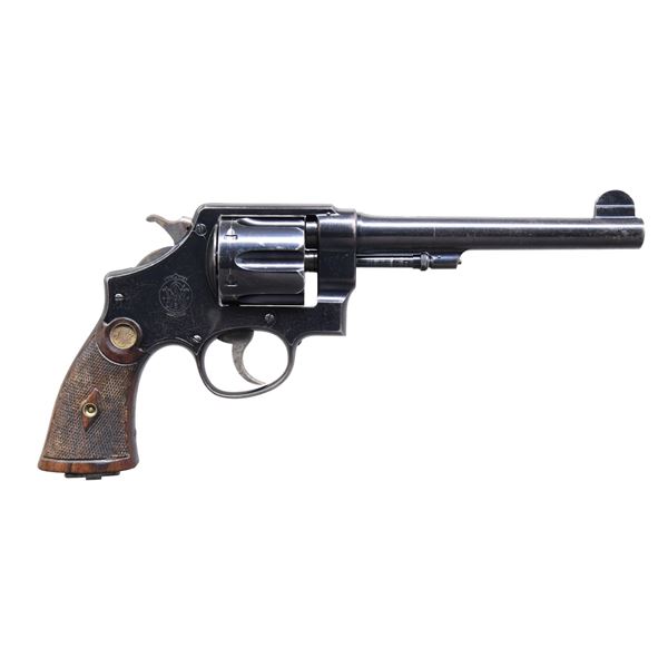 Cal. .455 Mark II. S# 14398. Bbl. 6 1/2" with integral 1/2 moon front sight; fame notched rear. Mfg. 1915-1917 for England within known Commercial range of 13000-16000. Crossed pennants on left top front of frame plus Enfield proof having Broad Arrow, "E" and "II" (Second Model) on left rear of frame by top of back strap; no additional proofs or marks. Matching numbered frame, barrel (with "B" indicating blued finish), cylinder and extractor. Unnumbered checkered walnut grips are correct Service style with diamond centers and recessed gold medallions. Proper lanyard swivel in butt. Smooth gripstraps. Case colored smooth faced trigger and hammer with finely checkered spur. Speculation would suggest this was supplied during England's dire need for firearms and proofed upon arrival at Enfield. CONDITION: good with factory quality refinish being slightly glossier than normal; proofs have raised "halos" that have not been polished over (proofed after refinish). Light marks and finish loss showing mainly on barrel. Peppery oxidation on gripstraps. High point finish loss plus portions of cylinder to include turn line. Lanyard swivel with grey patina tone. Faded case colors with slight pinprick oxidation. Light marks and faint before refinish light pitting. Moderate pitting and oxidation on side of frame under grips. Very good to excellent bright shiny bore with hint of lead build up. Fair to good grips with filled-in checkering and hand wear. PROVENANCE: From the Lifelong Collection of George Staden S&W Member #3451. (25-66/NW). CURIO. $500-750.