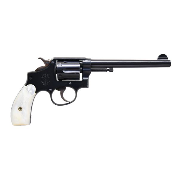 REVOLVER. Cal. 38 Spl. S# 79. Bbl. 6 1/2" pinned having company markings on top; no markings on sides. Integral 1/2 moon front sight blade; U notched rear sight. Mfg. 1899 (1899-1902) with round butt K frame; Civilian model as Army-Navy models had 6" barrels plus additional military markings. Matching numbers on barrel, frame and cylinder; unmarked extractor. Real pearl Service style grips; no medallions. Case colored smooth faced trigger and hammer with finely checkered spur. Often referred to as "pre 5 screw" with 4 screw side plate and no locking lug on barrel. CONDITION: fair to good non-factory refinish with light scratches mainly on barrel plus slight cylinder turn line. Very good case colors. Near excellent bore and grips. Fine mechanics and timing. PROVENANCE: From the Lifelong Collection of George Staden S&W Member #3451. (25-36/NW). CURIO. $450-600.
