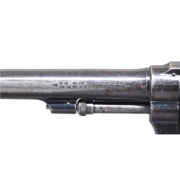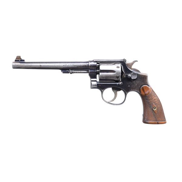 REVOLVER. Cal. 38 Spl. S# 62241. Bbl. 6 1/2" pinned having company markings on top plus caliber on left side along with "U. S. SERVICE CTG'S.". Integral sight base with Patridge blade; frame contoured adjustable rear sight. Mfg. 1903-1904 with round butt 4 screw side plate as K frame. Only 28,645 units total and very few target models. Yoke has spring loaded plunger to help hold open cylinder. Most examples are round butts with the first square butts about number 58000. Matching numbers on barrel, frame and extractor. Cylinder ends with "3" rather than "1". Checkered walnut service style grips without markings or medallions. Case colored smooth faced trigger and hammer with finely checkered spur. CONDITION: fair to good finish with imperfections of peppery oxidation, light scratches, high point wear, patina in grip area, notable finish loss on cylinder plus cylinder turn line. Near excellent bore and good hand worn grips. Fine mechanical functioning with near excellent timing. PROVENANCE: From the Lifelong Collection of George Staden S&W Member #3451. (25-45/NW). CURIO. $350-500.
