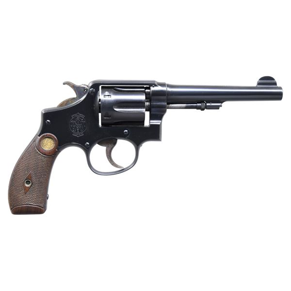 Cal. 38 Spl. S# 102501. Bbl. 5" pinned with integral 1/2 moon front sight; fame notched rear. Patent info on top of barrel plus caliber marking on left along with "U.S. SERVICE CTG'S". Yoke lock on barrel, 4 screw side plate plus 1 in front of trigger guard, detent in yoke to facilitate loading / ejecting, round butt K frame and checkered walnut grips having diamond centers and recessed brass medallions. Mfg. 1906-1909 (73,648 units) with blued finish plus case colored smooth faced trigger and hammer with finely checkered spur. Matching numbers on barrel, cylinder and extractor; grips pencil numbered to another revolver. Only frame marking is S&W logo on sideplate. Three punch dots in a row on lower edge of front strap. CONDITION: near excellent overall appearance with top quality factory style refinish. Light function wear and pin prick oxidation on hammer and trigger. Function wear on ejector rod not commensurate with overall finish. Fair to good bore with cleaned pitting throughout along with hint of wear. Beautiful grips with non factory replacement screw and left escutcheon. Fine mechanical functioning and proper timing. PPROVENANCE: From the Lifelong Collection of George Staden S&W Member #3451. (25-46/NW). CURIO. $350-500.