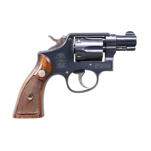 Cal. 38 Spl. S# C 158612. Bbl. 2" pinned having company and caliber markings on left side of barrel with integral 1/2 moon front sight blade; square notched rear sight. Mfg. 1948-1951 with square butt 5 screw K frame. Matching numbers on barrel, frame, cylinder, extractor and checkered walnut Magna grips having diamond center. UNATTACHED ACCESSORIES: fair 2 piece blue box having ".38 MILITARY & POLICE", "MODEL 10" and "2-INCH BARREL" plus brown waxed packing paper and warranty card. CONDITION: good original finish with peppery oxidation, some slight high point wear and light peening at edges of cylinder stops. Very good case colors. Good plus grips with light handling marks. Near excellent bore. PROVENANCE: From the Lifelong Collection of George Staden S&W Member #3451. (25-52/NW). CURIO. $350-500.