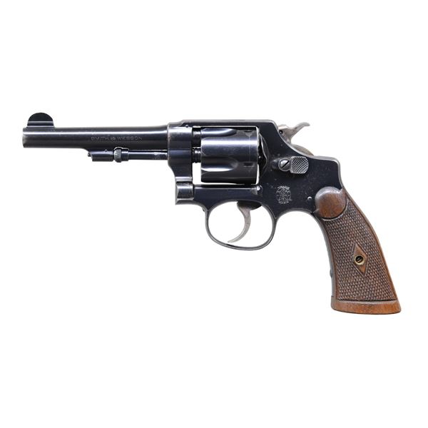 Cal. 38 S&W. S# 35524. Bbl. 4" pinned with integral 1/2 moon blade front sight; square notched frame rear sight. Top of barrel with patent dates, S&W markings on left plus caliber and "REGULATION POLICE" on right. Mfg. 1917-1940 (54,474 units) on I frame with 4 screw sideplate plus screw in front of trigger guard. Round butt frame with shouldered backstrap having diamond center checkered walnut square butt grips that are without medallions and with proper stamped patent date on bottom of left grip. Flat hammer spring and checkered thumbpiece latch. Matching numbers on frame (frontstrap), barrel (additionally with "B" to indicate blued finish), cylinder (5 rd.) and extractor. Case colored smooth faced trigger and finely checkered hammer. CONDITION: good plus appearance of factory quality refinish. Areas of peppery oxidation on frame and hammer plus heavier oxidation on top strap. Very faint cylinder turn line. Ejector rod is resistive in some positions. Good plus grips with slight handling marks and hand wear plus very small chip at top front of left grip. Near excellent bore. PROVENANCE: From the Lifelong Collection of George Staden S&W Member #3451. (25-85/NW). CURIO. $350-500.