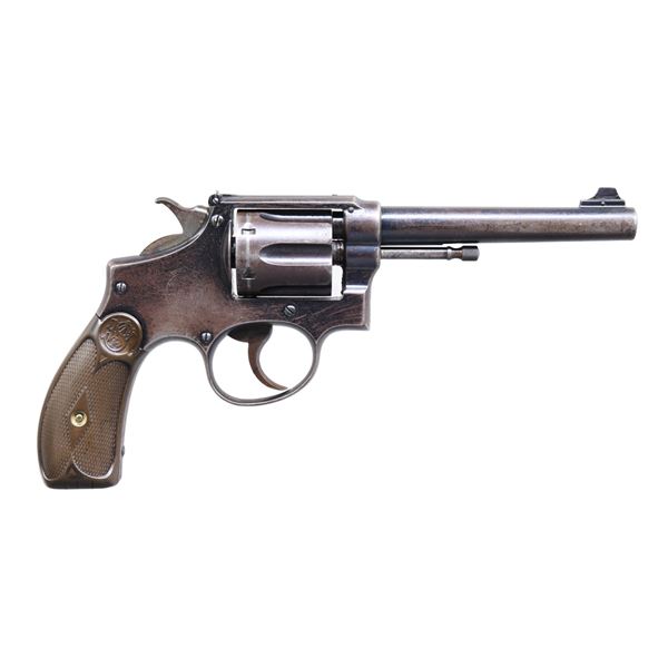 REVOLVER. Cal. 32 Winchester (32-20). S# 3203. Bbl. uncommon 5" with pinned front sight blade; frame mounted adjustable rear. Mfg. 1899-1902 from serial number 1 to 5311 as first model; significant premium for target model. Matching numbers on frame, cylinder and barrel. Monogrammed checkered hard rubber grips numbered 115261 on right plus unmarked on left; each has 3 "kill notches" at bottoms. Butt has 5 pointed rework star plus left side of frontstrap rework dated "5.17"; has "2" and larger sized "8" near it at top side of frontstrap. Case colored checkered hammer and smooth faced trigger. UNATTACHED ACCESSORIES: modern S&W 1 piece box with fabricated label representing this revolver. CONDITION: good general appearance with patina, high edge thinning, peppery oxidation plus turn line on cylinder. Moderately hand worn grips. Slightly out of time. Fair, pitted bore plus pitting on cylinder face. PROVENANCE: From the Lifelong Collection of George Staden S&W Member #3451. (25-55/NW). CURIO. $650-900.