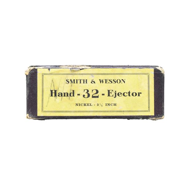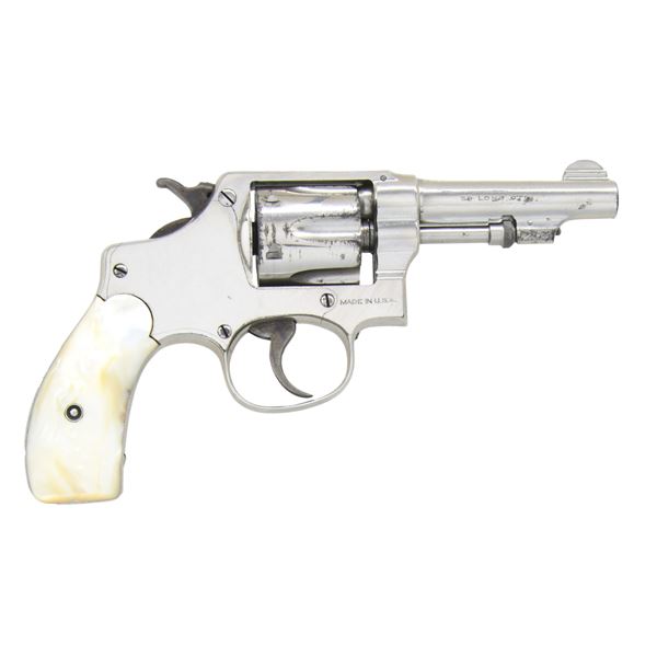 Cal. 32 S&W Long. S# 453660. Bbl. 3 1/4" pinned with integral half moon front sight blade; frame notched rear sight. Mfg. 1917-1942 with nickel finish, real pearl grips (no medallions) plus case colored hammer and trigger. Round butt 5 screw I frame with heat treated 6 round cylinder (initiated 1920 at serial number 321000) of 1.250" length. UNATTACHED ACCESSORIES: rare hinged 1 piece maroon box with penciled bottom having "453727", "5241", "523??", "$28.00" (below line) and "XLLA" (above line); likely code for seller's cost. Very good overall condition. CONDITION: good plus appearance with some marks, cylinder turn line, light scratches and spotty finish loss (mainly on cylinder). Very good to excellent case colors on trigger and hammer. Near excellent bore and grips. Proper timing and mechanical functioning. PROVENANCE: From the Lifelong Collection of George Staden S&W Member #3451. (24-63/NW). CURIO. $350-500.