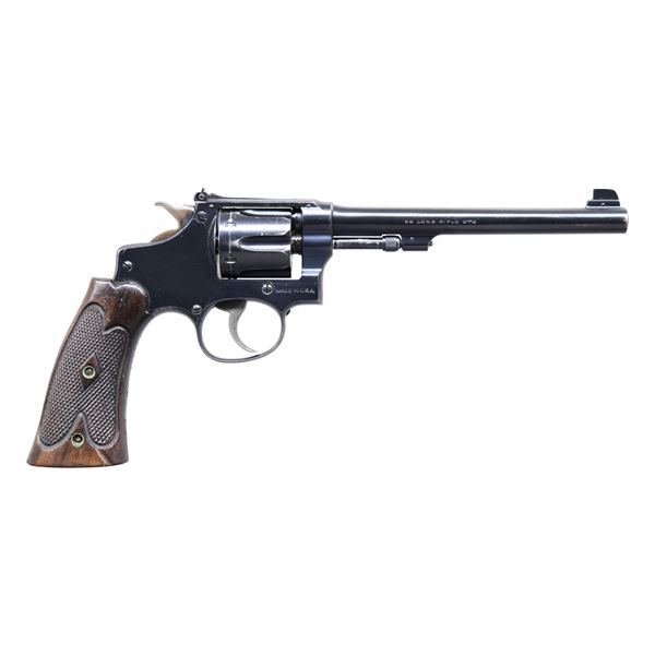 Cal. 22 LR. S# 488155. Bbl. 6" pinned with integral base having 1/10" Patridge blade. Frame contoured adjustable rear sight is later style with T-slot in frame similar to modern S&W's. Mfg. 1915 -1935 (1911-1941 for all .22/32 HE's) as Bekeart style became a regular model in 1935 (S#160000) with recessed chambers in cylinders (this is not recessed and with dowel pins). Bekeart style, as "true" Bekeart's were a special orders to a dealer in San Francisco. The term "Target Model" came into use post 1945. Matching numbered frame, barrel, cylinder, ejector and grips (by pencil internally; no number on butt exterior). Case colored serrated trigger and hammer with finely checkered spur. CONDITION: very good appearance with some thinning at high points such as muzzle and a noticeable turn line on cylinder. Good to very good grips with light marks in butt area. Good case colors with function wear. Near excellent bore. Fine mechanics with proper timing. PROVENANCE: From the Lifelong Collection of George Staden S&W Member #3451. (25-73/NW). CURIO. $450-600.