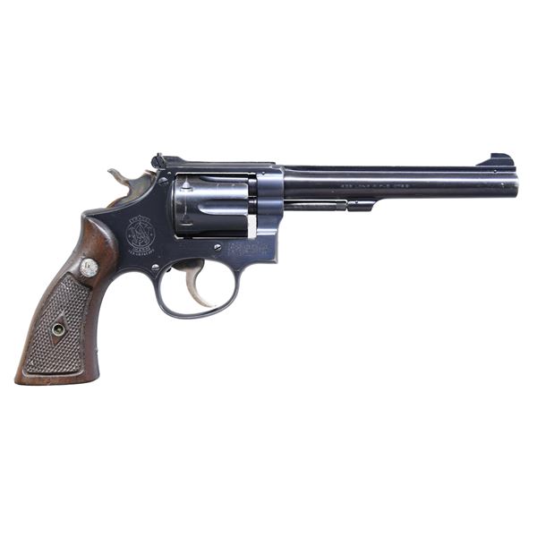 Cal. 22 LR. S# K 51412. Bbl. early 6" pinned with narrow rib and slight taper. Ramped Patridge front sight plus frame mounted Micrometer adjustable rear. Mfg. 1948 with 5 screw K frame, 1.6" recessed cylinder plus 6 grooves on grip straps. Diamond center checkered walnut Magna grips with silver medallions. Case colored standard width serrated trigger plus wide spur checkered hammer spur. Matching numbers on frame, cylinder, extractor barrel and grips. UNATTACHED ACCESSORIES: very good plus 2 piece gold factory box with proper end markings. Aluminum factory cleaning rod plus swab and larger caliber bore brush. CONDITION: generally very good appearance with some slight high point finish wear to include turn line on cylinder along with a couple of light scratches. Near excellent case colors on hammer and trigger plus near excellent bore. Light grip marks plus diamond top wear on left grip near butt. PROVENANCE: From the Lifelong Collection of George Staden S&W Member #3451. (25-76/NW). CURIO. $450-600.