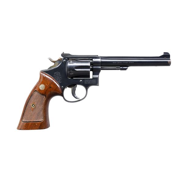 Cal. 22 LR. S# K190879. Bbl. 6", pinned. Patridge front sight. Adjustable square notch rear sight. Matching numbers on the frame, bbl., cyl., and extractor. K22 revolver mfg. 1953. Six-shot, recessed cyl. Blued finish with case-colored trigger and hammer. Trigger has trigger shoe present. Unnumbered checkered walnut target grips with silver S&W medallions. CONDITION: Grips have added varnish with a couple of light chips, scattered small dings, handling marks, and flaking varnish. Trigger and hammer retain most of their case colors with some operational wear. Balance of metal retains 85% of its original blue, with some edge wear, a few patches of oxidation (mostly on the cyl.), varnish overrun, and operational wear. Action functions properly when hand-cycled. Very good, bright bore. (24-7210/MJC). CURIO. $400-600.