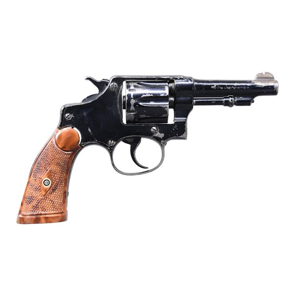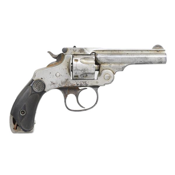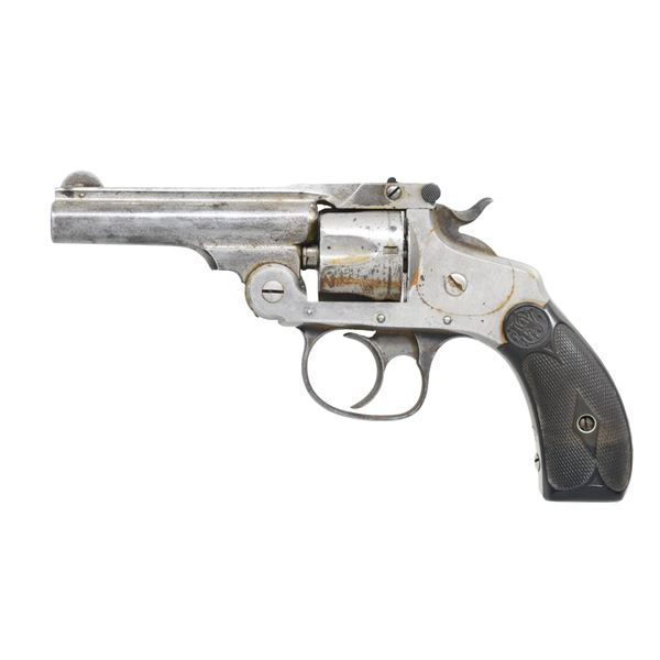 This lot consists of the following Smith & Wesson DA revolvers: 1) S&W 32 DA Revolver. Cal. 32 S&W. S# 158397. Bbl. 3". Rnd. blade front sight. U-notch rear sight. Front model 32 DA revolver. Nickel finish with case colored trigger & hammer. Checkered black grips with S&W medallions. CONDITION: bottom of right panel shows a large chunk missing, grips otherwise show scattered dirt staining & handling marks. Trigger & hammer retain strong traces of case colors with scattered oxidation & fading to gray. Balance of metal shows scattered flaking, oxidation & pitting. Hammer not cycling either in SA or DA. Pitted worn bore. (25-310/MJC). 2) S&W 32 HE DA REVOLVER. Cal. 32 S&W. S# 304636. Bbl. 3 1/4". Round blade front sight that is missing a small piece. Fixed rear sight. 32 HE 5th changed DA revolver. Repainted black enamel finish. Checkered brown plastic aftermarket grips. CONDITION: grips display a poor fit & show some handling marks. Metal retains 70% repainted black enamel with scattered flaking. Cyl. appears to be loose when cocked & may have a timing issue. Poor pitted bore. PROVENANCE: The Estate Collection of Charles Wagner. (25-311/MJC). BOTH CURIO. $200-400 for pair.
