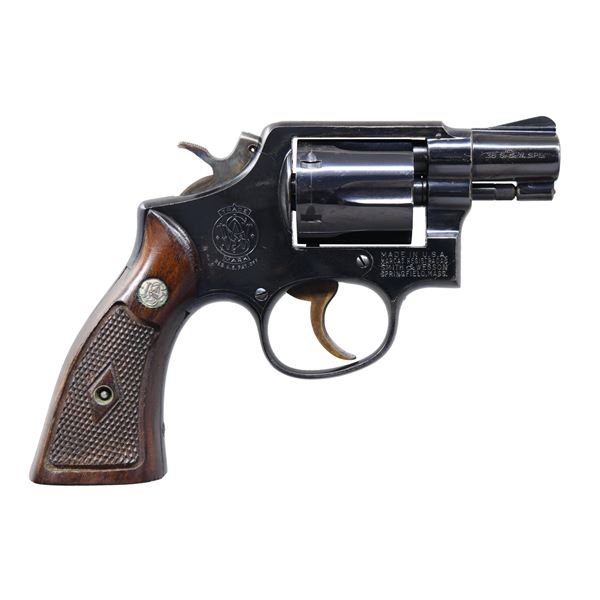 Cal. 38 Spl. S# C465888. Bbl. 2" pinned. Ramped serrated blade front sight. Fixed rear sight. Early no-dash Model 10. Blued finish with case colored hammer & trigger. Checkered walnut grips with mismatched right panel & silver S&W medallions. UNATTACHED ACCESSORIES: matching numbered factory box. CONDITION: front of right grip panel shows a tiny crack, grips otherwise show a couple dings & few handling marks. Trigger & hammer retain most of their case colors with some dried grease & light operational wear. Balance of metal retains 85% original blue with a couple patches of light pitting on cyl., some fading to gray, some dried grease, edge wear & light scratches. Action functions properly when hand cycled. Action functions properly when hand cycled. Bright near excellent bore. PROVENANCE: From the Lifelong Collection of George Staden S&W Member #3451. (25-88/MJC). CURIO. $500-750.