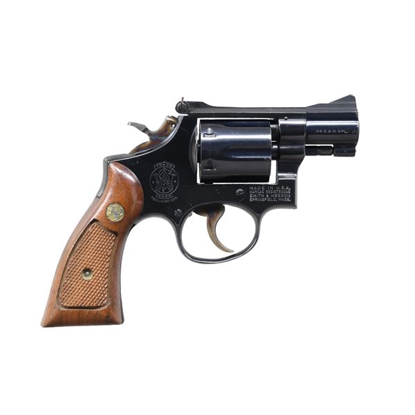 Cal. 38 Spl. S# 8K51036. Bbl. 2" pinned. Ramped serrated blade front sight. Adjustable square notch rear sight. Blued finish with case colored trigger & hammer. Checkered walnut grips with silver S&W medallions. CONDITION: right grip panel shows a crack running from bottom to just below checkering & a notable gouge at bottom rear. Grips otherwise show a small crack at right rear, a couple small chips, scattered flaking & handling marks. Trigger & hammer retain most of their case colors with some operational wear. Right side of rear sight is chipped & missing. Balance of metal retains 85% original blue with scattered light oxidation, edge wear & some light scratches on cyl. Action functions properly when hand cycled. Bright very good + bore. PROVENANCE: From the Lifelong Collection of George Staden S&W Member #3451. (25-96/MJC). MODERN. $500-800.