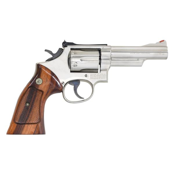 Cal. 357 Mag. S# 73K4710. Bbl. 4" pinned. Ramped serrated blade front sight with orange insert. Adjustable square notch rear sight with white outline. Nickel finish with case colored trigger & hammer. Checkered target grips with silver S&W medallions. UNATTACHED ACCESSORIES: matching numbered factory box with manual, paperwork & screwdriver. CONDITION: grips show some handling marks & scatterered flaking varnish. Trigger & hammer retain nearly all their case colors with some light operational wear. Balance of metal retains nearly all of its original nickel with some light scratches, handling wear & operational wear. Action functions properly when hand cycled. Bright near excellent bore. PROVENANCE: From the Lifelong Collection of George Staden S&W Member #3451. (25-103/MJC). MODERN. $500-800.