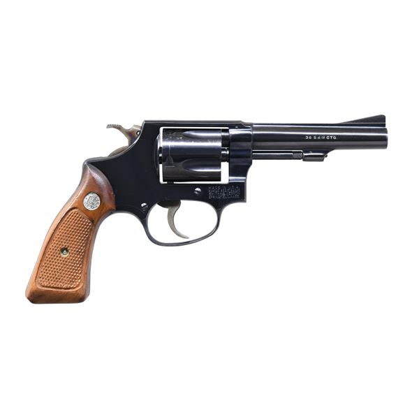 Cal. 38 S&W. S# 118729. Bbl. 4" pinned. Ramped serrated blade front sight. Fixed rear sight. Mfg. 1961-1974. Five-shot cyl. Bbl. markings have added white highlight paint. Blued finish with case colored trigger & hammer. Checkered walnut grips with matching numbered right panel & silver S&W medallions. UNATTACHED ACCESSORIES: matching numbered factory box. CONDITION: grips show light handling wear. Hammer & trigger retain most of their case colors with some light operational wear. Balance of metal retains 95% original blue with some light edge & operational wear. Action functions properly when hand cycled. Bright near excellent bore. PROVENANCE: From the Lifelong Collection of George Staden S&W Member #3451. (25-128/MJC). CURIO. $300-500.