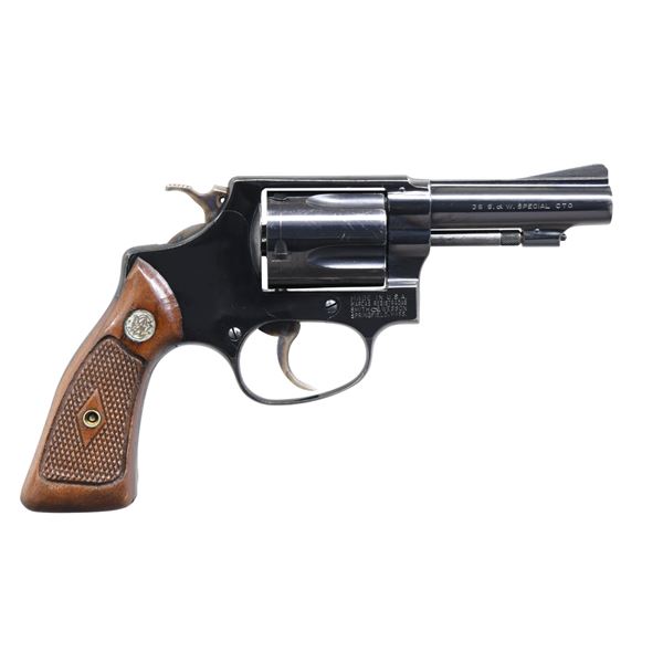 Cal. 38 Spl. S# 485377. Bbl. 3", pinned. Ramped, serrated blade front sight and fixed rear sight. No-dash 36, mfg. 1960s. Five-shot cyl. and flat latch. Blued finish with case-colored trigger and hammer. Checkered walnut grips with matching-numbered right panel and silver S&W medallions. UNATTACHED ACCESSORIES: Matching-numbered factory box with manual and paperwork. CONDITION: The right grip panel shows a small chip at the top rear; the grips otherwise show a few light dings and some handling marks. Hammer and trigger retain much of their case colors, with some light oxidation specks and operational wear. Balance of metal retains 90% of its original blue, with scattered edge wear, mostly on the cyl. and trigger guard. Cyl. release is very stiff due to grease buildup; the action otherwise functions properly when hand-cycled. Very good+, bright bore. (24-7171/MJC). CURIO. $300-500.